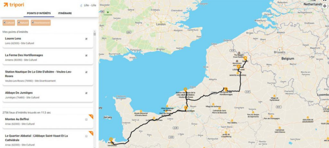 Tripori est un assistant de voyages qui facilite l’organisation de road trips en France. Tripori permet aux voyageurs de découvrir de nouveaux lieux d’intérêt correspondant à leurs critères et centres d’intérêt, de les aider dans la création de leur itinéraire personnalisé, et de gagner du temps dans l’organisation de leur voyage. Le voyageur indique son point de départ et d’arrivée, Tripori lui suggère des choses à faire et à voir sur son trajet, il sélectionne les points d’intérêt qui l’intéressent et ils s’ajoutent à son itinéraire. Le voyageur peut également créer son itinéraire pas à pas après avoir renseigné son point de départ.