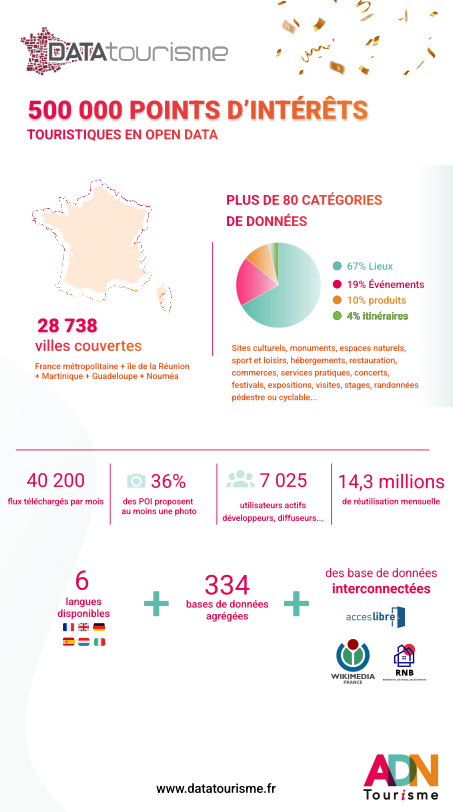 Le guichet unique DATAtourisme est alimenté par les offices de tourisme, comités départementaux et régionaux de tourisme, pour la plupart adhérents d’ADN Tourisme. Il était donc logique que la Fédération se saisisse pleinement de cet outil et poursuive son développement.